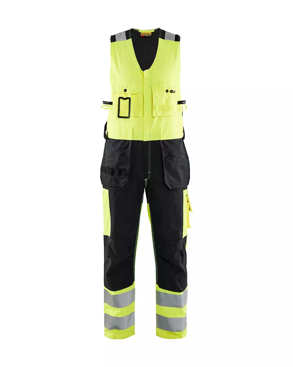 The Blåkläder 2653 High-Visibility Overalls RT are robust and durable overalls designed for fitters in construction and industrial environments. Made from 300g/m² satin fabric comprising 85% polyester and 15% cotton, these overalls offer both comfort and resilience. Key Features: — Hanging Pockets: Equipped with multiple hanging pockets for ample storage of tools and accessories. — Comfort and Flexibility: Features a flexible back section for enhanced mobility and adjustable shoulder seams for a personalized fit. — Durability: CORDURA® reinforced knees for increased durability. — High Visibility: 50 mm and 70 mm wide reflective strips for enhanced visibility in low-light conditions. Reflectors are positioned around the legs and shoulders. Available in High visibility yellow or High Visibility Orange. — Multiple Pockets: Versatile pockets including a bellows thigh pocket with flap, hanging chest pockets, knee pad pockets, back hanging pockets, and a ruler pocket. — Certification: Certified to EN ISO 20471 Class 2 for guaranteed high visibility. — Knee Protection: EN 14404:2004+A1:2010 compliant when used with knee pads 4027, 4057, 4058, and 4032. — Additional Details: Hammer loops, wide belt loops, ID card pocket, and a two-way metal zipper. — Material Composition: 85% polyester, 15% cotton, satin, 300g/m². — Color Codes: PM5059, PM5060, PM5063, PM5211, PM5212. — Washability: Machine washable up to 50 times. — Additional Information: Fluorescent fabric that is both comfortable and durable. — Colors: High visibility yellow and High Visibility Orange.