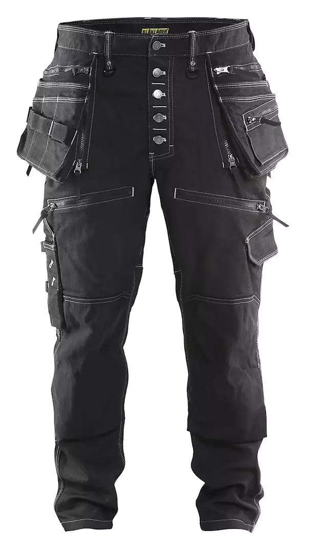 Ominaisuudet: Materiaali: 55% puuvilla, 30% polyesteri, 15% polyamidi, denim, päällystetty, CORDURA® Denim, stretch, 340 g/m² Toiminnallisuus: Kahteen suuntaan joustava stretch-materiaali, matala haara ja joustavat osiot haaroissa ja pohkeissa takaavat erinomaisen liikkuvuuden. Vahvikkeet: CORDURA® 1000 -vahvistetut riipputaskut, takataskut, mittatasku, reisitaskut ja polvet lisäävät kestävyyttä. Yksityiskohdat: Napeilla suljettava sepalus, kaksi napillista lenkkiä vasaranpidikettä varten sivuilla, leveät vyölenkit takana ja sivuilla, metalliset napit, napillinen puukonpidike ja D-rengas vyötäröllä. Taskut: Paljetakatasku, vetoketjullinen reisitasku, vetoketjulliset etutaskut, polvisuojataskut, erikoisleveät riipputaskut työkalulenkeillä ja lisälokerot työkaluille, vetoketjut riipputaskujen kiinnittämiseen etu- ja takareunasta, vahvistettu mittatasku puukonpidikkeellä ja kynätaskulla.