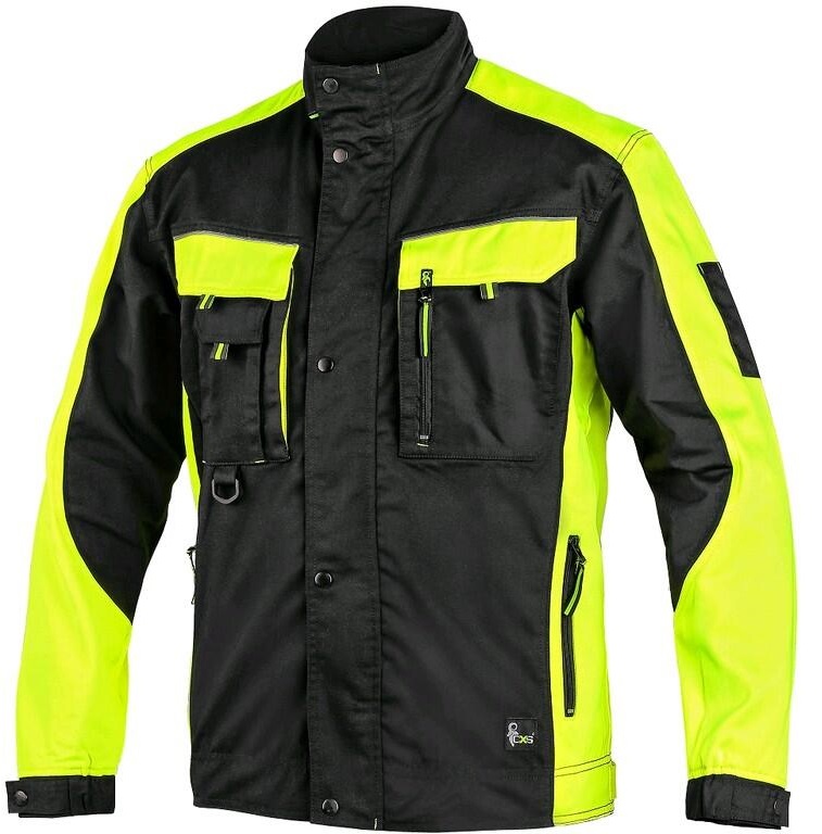 The CXS Brighton is a comfortable and practical black-yellow work jacket designed for professionals who require durable and well-fitting workwear. It features versatile pockets and adjustable details, making it ideal for a wide range of tasks. - Features: - Large multifunctional chest pockets. - Zippered side pockets. - Adjustable cuffs and waist. - Covered zipper closure with snap buttons. - Reflective details for enhanced visibility. - Recommended Applications: Construction, machining, light industry, road and towing services, logistics, warehousing, automotive maintenance, agriculture, gardening, and hobbies. - Material: 65% polyester, 35% cotton. Fabric weight: 270 g/m². - Certifications: EN ISO 13688, OEKO-TEX® STANDARD 100. - Sizes: 44–68. - Colors: Black/yellow and black/orange. The CXS Brighton work jacket combines durability, practicality, and comfort, making it an excellent choice for versatile professional use.