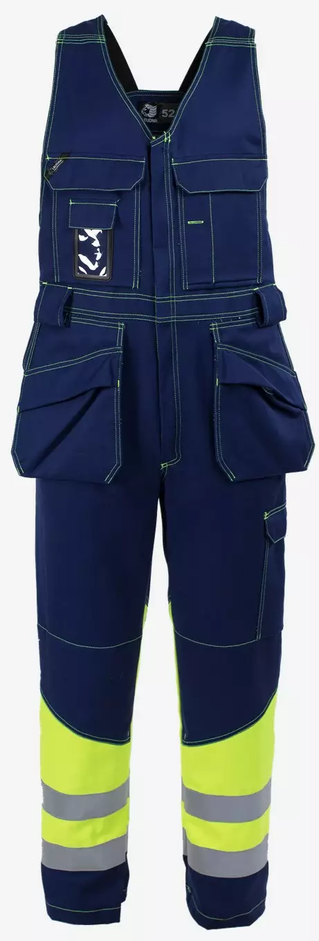Edessä kaksisuuntainen vetoketju piilossa / Kaksi rintataskua, taskunkansissa tarrasulku, vas. rintataskun päällä kynä-/puhelintasku, henkilökorttitasku oikealla rintataskussa / Korttitaskussa tarrasulku / Takatasku ja vasaralenkki / Reisitasku kannella / Mittatasku / Polvisuojataskut sisäpuolella / Vyötäröllä takana kuminauha / Leveät vyölenkit ja vyötunnelit / Edessä olalla pidennysvara / Edessä riipputaskut on kiinnitetty vyötärölle päällitikkauksin, jotta ne on mahdollista haluttaessa purkaa irti / Lahkeensuissa pidennysvaraa. Standardit: Näkyvä EN ISO 20471 luokka 1, Kuumansuoja EN ISO 11612 A1 B1 C1 E1 F1, Hitsaus EN ISO 11611 luokka 1 A1, Valokaari EN 61482-1-2 luokka 1 [4kA] / ÖKO-TEX® -sertifioitu.