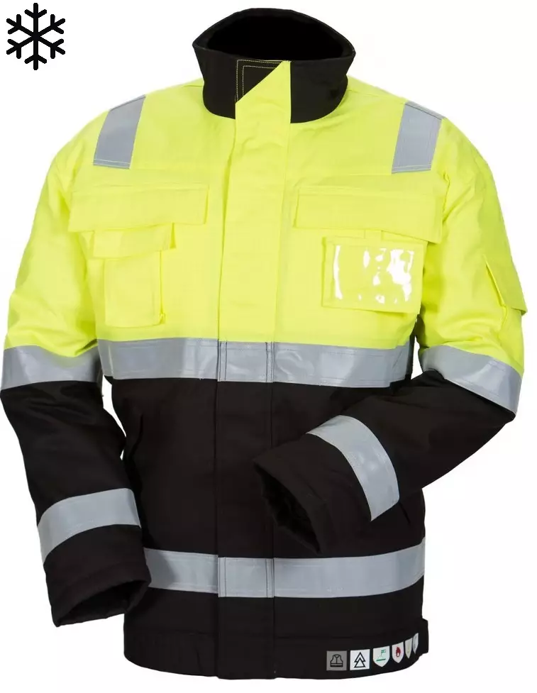 -Affordable and High-Quality Flame-Resistant High-Visibility Winter Jacket – Cotton Blend- This winter jacket provides safety and comfort at an affordable price. Made from durable, flame-resistant cotton-blend fabric, this jacket is ideal for tasks with a high wear-and-tear risk where compliance with essential standards is required without extra cost. Its lighter weight (260g/m²) makes it a great option for tasks where heavy-duty fabric is unnecessary. -Material and Construction- - 75% cotton, 24% polyester, 1% antistatic fiber - Fabric weight: 260g/m², flame-resistant lining 160g/m² -Safety Certifications- - EN ISO 20471:2013 Class 2: High-visibility clothing, Class 2 - EN 13034:2005+A1:2009 Type 6: Limited protection against liquid chemicals - EN ISO 11612:2015: Protection against heat and flames (A1+A2 B1 C1 F1) - EN ISO 11611:2015 Class 1 A1: Welding protection - IEC 61482-2:2009 Class 1 (4kA): Arc flash protection - EN 1149-5:2004: Antistatic properties -Size Range and Fit- - Available in sizes 46–64, standard/relaxed fit -Features- - Color: Yellow/black for high visibility and style - Practical pocket design: 9 pockets, including two chest pockets with flaps (one with a zipper and D-ring, the other with an ID card pocket), zippered side pockets, an inner pocket, a sleeve pocket, and a pen pocket - Windproof zipper up to the collar, quality YKK zippers - Adjustable hem with Velcro fastening, cuffs with ribbed inner lining and Velcro adjustment This winter jacket is designed for protection and comfort without added costs – a practical choice for work sites where reliable flame resistance and high visibility are a must.