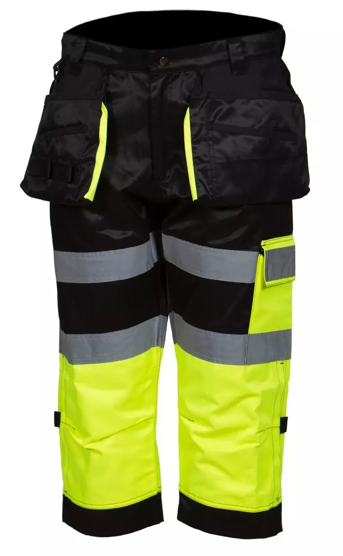 High visibility capri hanging pocket trousers in orange/black and yellow/black EN 20471 Class 1 certified high visibility pirate trousers designed for excellent visibility and practicality. These trousers are made from dirt- and water-repellent Beaver nylon fabric, with high visibility colors consisting of 80% polyester and 20% cotton. The fabric weight is 250 g/m², providing durability and comfort. Sizes: 46–64 Colors: Orange/black and yellow/black EN 20471:2013 Class 1 certification Features: - 10 pockets, including a zippered and flap-secured thigh pocket, back pockets, and spacious reinforced hanging pockets, one with an ID card pocket - Hammer loops and other functional loops - Side-access knee pad pockets - Waist with shirt-stopper feature - Wide belt loops Shipping time: From 2 business days Priha High Visibility Pirate Trousers are the perfect choice for those in need of durable and visible workwear with plenty of practical pockets and features.