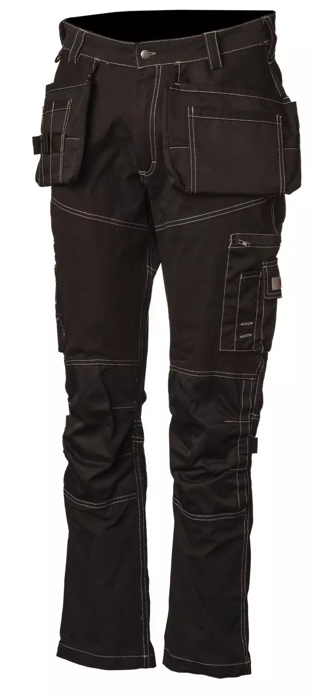 Priha riipputaskuhousut. Erittäin joustava ja miellyttävä ja hengittävä materiaali, Ei hiosta, Ei purista. 17 taskua mm. vahvistettu vetoketjullinen reisitasku, jossa kynä- ja kännykkätasku. Isot vahvistetut riipputaskut, joista toisessa on henkilökorttitasku, mittatasku, työkalutaskuja, D-lenkki. Muotoon ommellut polvet. Sivusta ladattavat polvisuojataskut. Tuplaommellut saumat.