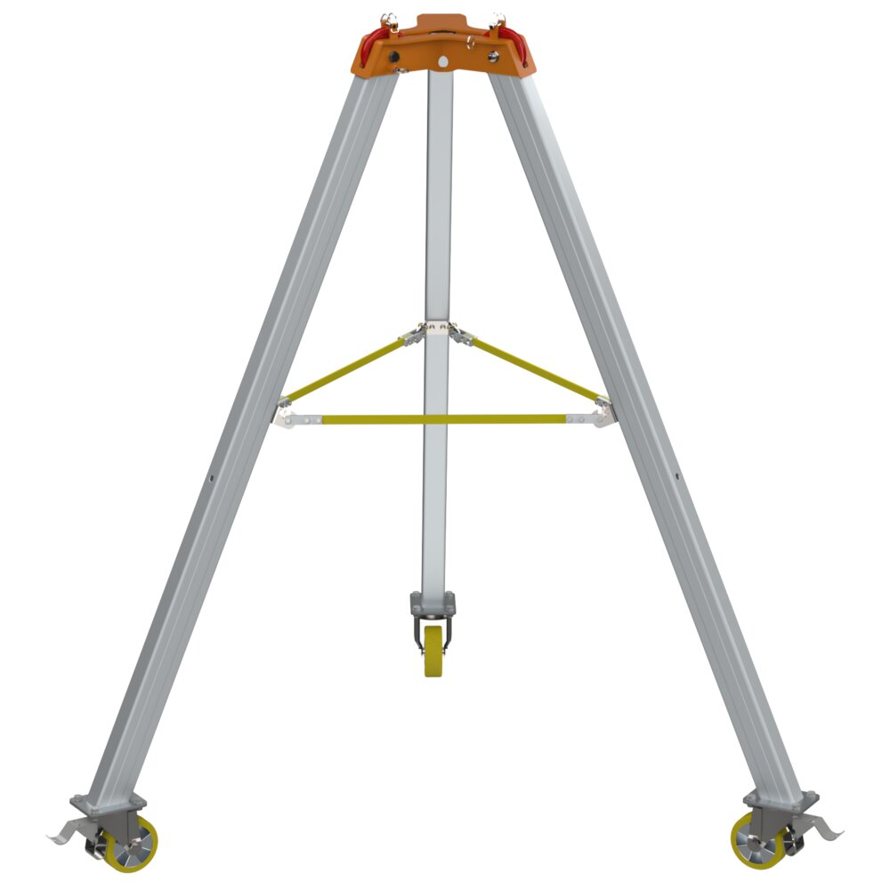 Alumiininen kolmijalka TM 6 pyörillä, joka on osa henkilösuojaimia korkealta putoamista vastaan. Tämä kolmijalka on testattu standardien EN 795 ja TS 16415 mukaisesti, väliaikaisena kiinnityspisteenä tyyppi B.