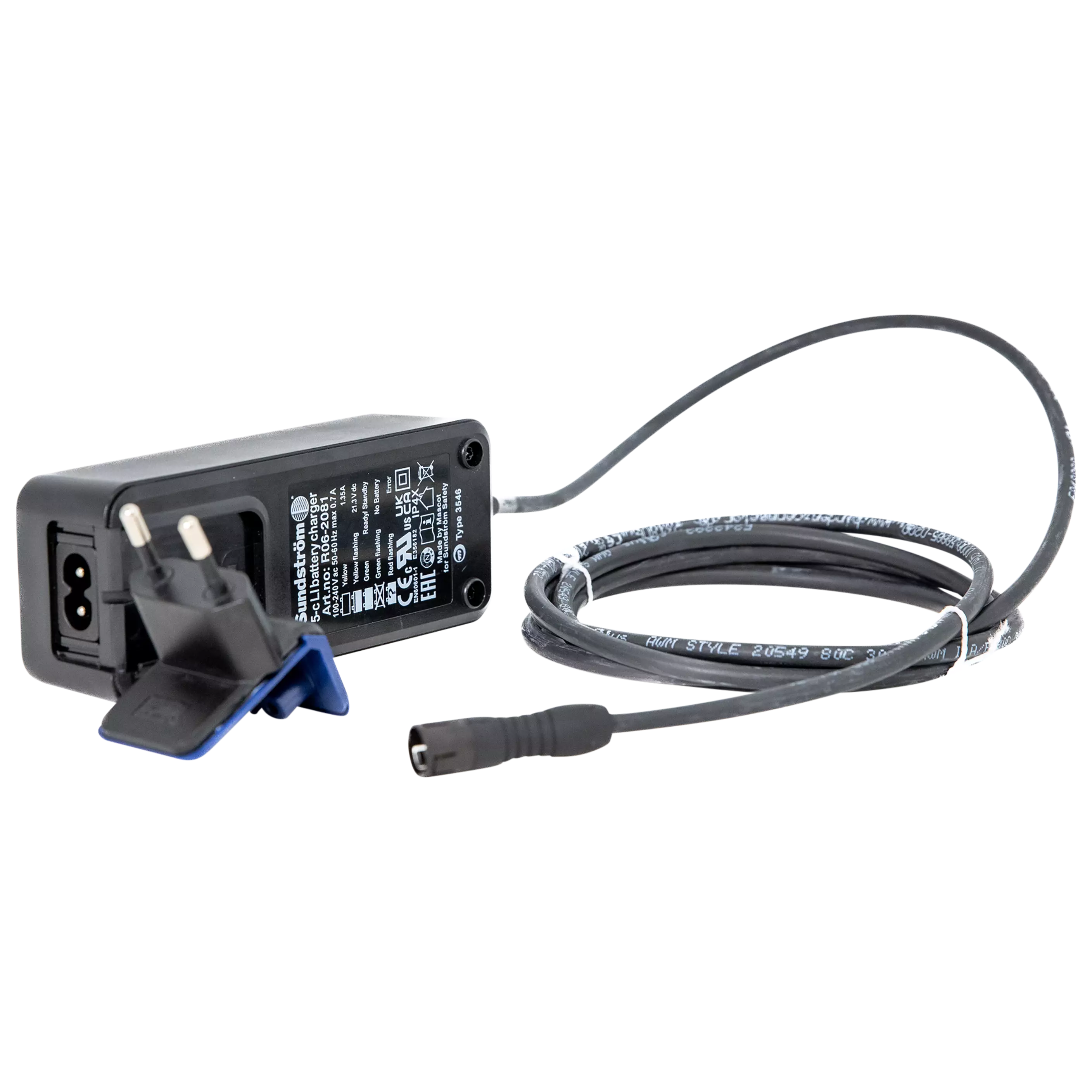 Akkulaturi Sundströmin SR 500 EX -puhaltimen järjestelmiin. Laturi on tarkoitettu SR 502 EX -litiumioniakulle ja sopii huolto-, varaosa- tai vaihtokäyttöön, kun alkuperäinen laturi on kadonnut tai vaurioitunut.