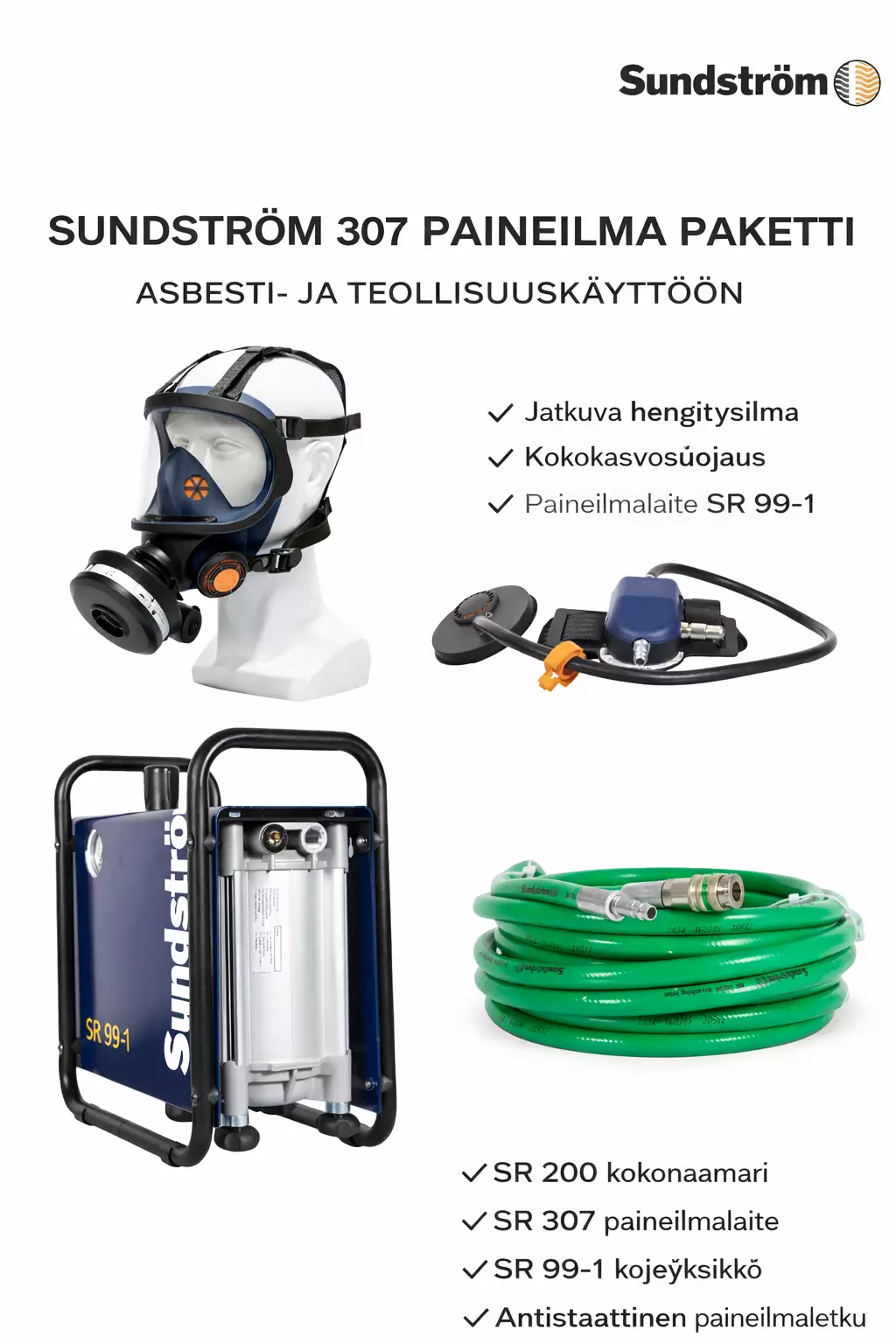 Sundström 307 compressed air package is an airline-based respiratory protection system for demanding industrial use. It is designed for environments with high contaminant levels where continuous breathable air supply and full-face protection are required.