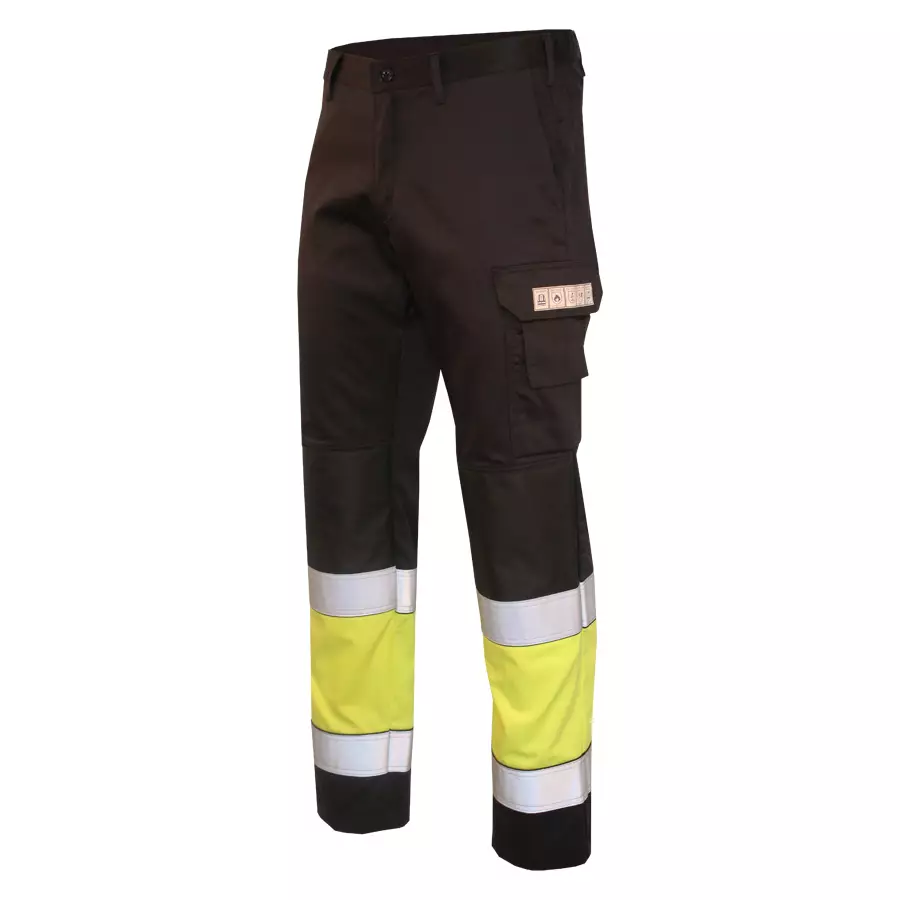 Mukavat ja istuvat huomiotyöhousut, joissa yhdistyvät näkyvyys, palosuojaus ja antistaattiset ominaisuudet. Fluoresoiva väri erottuu päivänvalossa ja hämärässä, ja heijastinnauhat lisäävät turvallisuutta pimeällä. Joustovyötärö parantaa istuvuutta ja liikkumisvapautta koko työpäivän ajan. Ominaisuudet Joustovyötärö – mukavuutta ja istuvuutta Etuviistotaskut Takatasku kannella, tarrakiinnitys Reisitasku kannella, tarrakiinnitys Matkapuhelintasku ja kynätasku Pitkä mittatasku työkalulenkillä Polvisuojustaskut sisäpuolella (polvisuojille) Hi-Vis-näkyvyys: fluoresoiva perusväri + heijastinnauhat Materiaalit Hi-Vis -kangas: 75 % puuvilla, 24 % polyesteri, 1 % antistaattinen kuitu Muu kangas: 80 % puuvilla, 19 % polyesteri, 1 % antistaattinen kuitu Käyttökohteet Rakennus ja infra, teollisuus, huolto ja kunnossapito sekä logistiikka – kun tarvitaan näkyvyyttä, FR-ominaisuuksia ja antistaattisuutta yhdessä toimivassa housuratkaisussa.