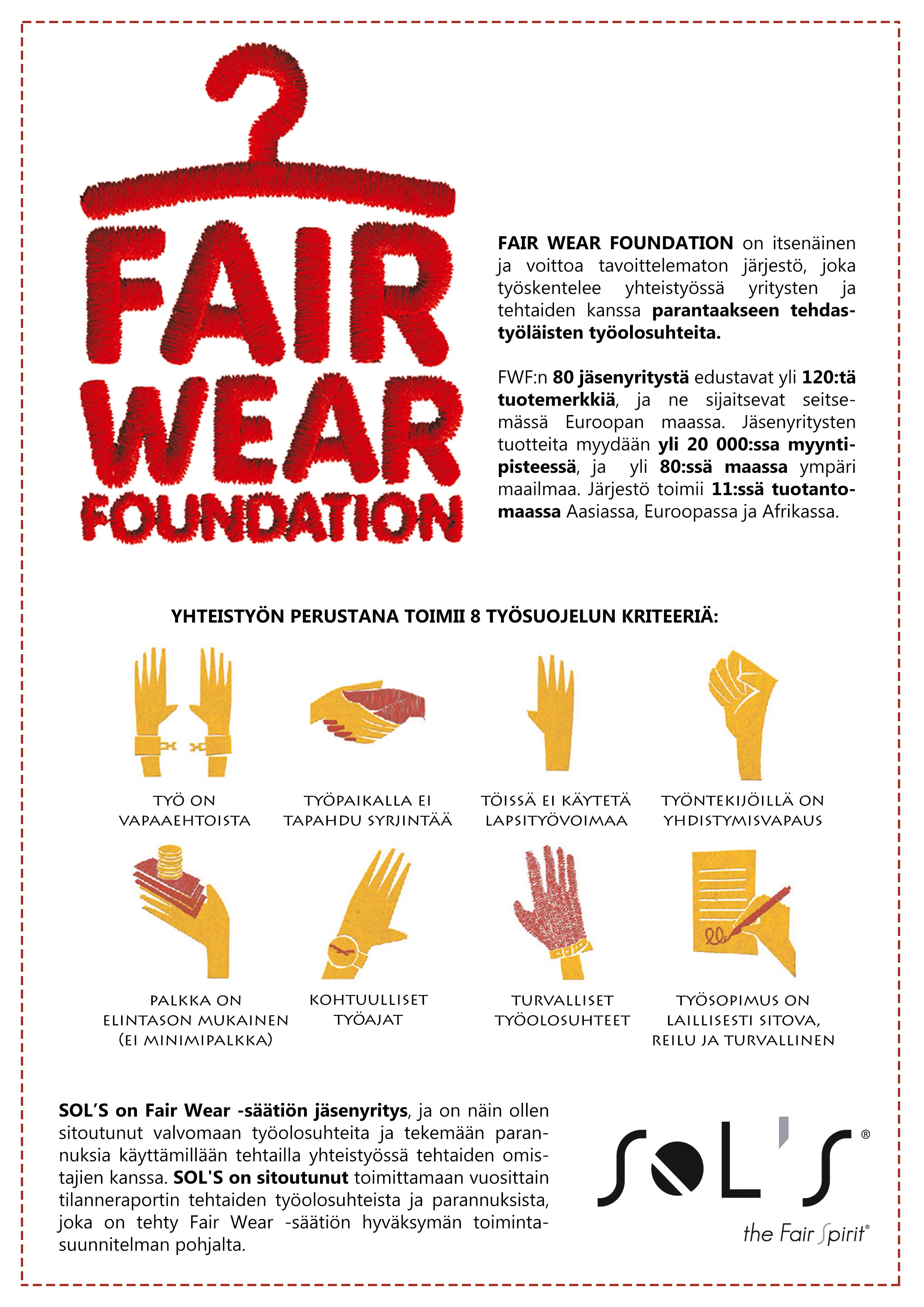 SOL’S-tuotteet ovat tuotettu eettisiä ja ekologisia arvoja kunnioittaen. Tuotannossa otetaan huomioon niin työntekijät kuin ympäristökin. Myös tuotteen turvallisuus on tärkeää. Siksi tuotteiden turvallisuutta testataan ja erityisesti lastentuotteille on hankittu siitä kertovia sertifikaateja. Merkillä onkin eniten sertifikaatteja alan toimijoista. SERTIFIKAATIT takaavat tuotteiden laadun ja kestävyyden, sekä yrityksen eettisen toiminnan. Tutustu esimerkiksi Fair Wear Foundation -sertifikaattiin.