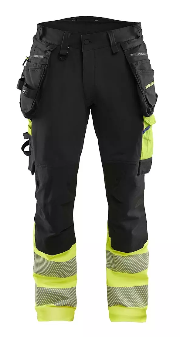 Highvis riipputaskuhousut 4-way stretch. Neljään suuntaan joustava materiaali takaa maksimaalisen mukavuuden ja näkyvyyden. Housuissa on katkonaiset heijastimet, irrotettavat riipputaskut ja CORDURA®-stretch-vahvistetut polvisuojataskut.