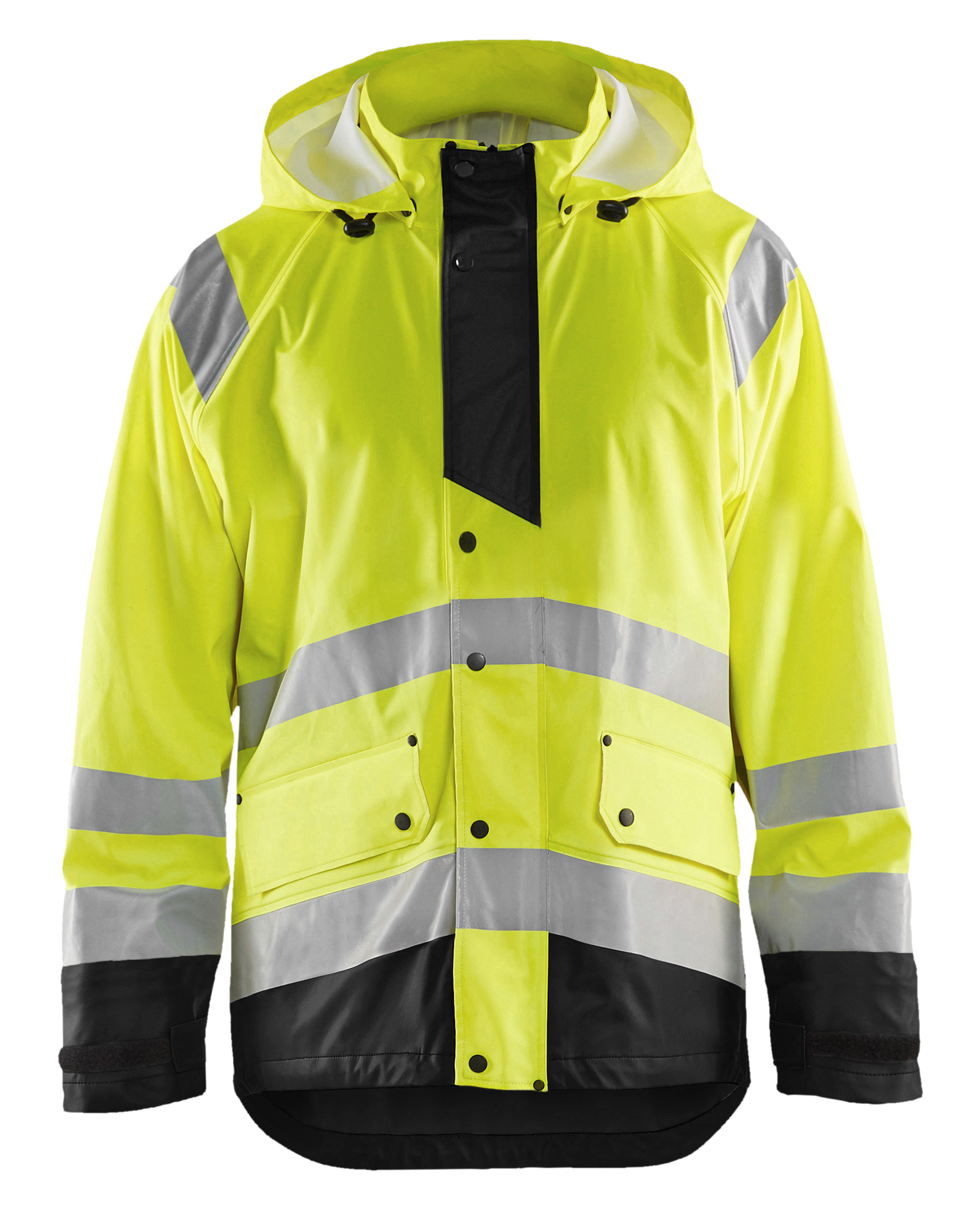 Kestävä ja toiminnallinen sadetakki. Irrotettava huppu, pehmeää fleeceä kauluksen sisäpuolella, kaksisuuntainen ylös kaulukseen asti ylettyvä vetoketju listan alla ja korkea tuulelta suojaava kaulus. Materiaali on tuulen- ja vedenpitävää, liimatuilla saumoilla ja selkäosassa on tuuletusaukot. Helma on säädettävissä kiristysnauhalla ja hihoissa on sisäpuolella neopreeni rannekkeet, jotka estävät veden valumisen hihaan lisäksi hihat voidaan säätää tarroilla. Sertifioitu EN 343, luokka 3.1 ja EN ISO 20471 luokka 3.