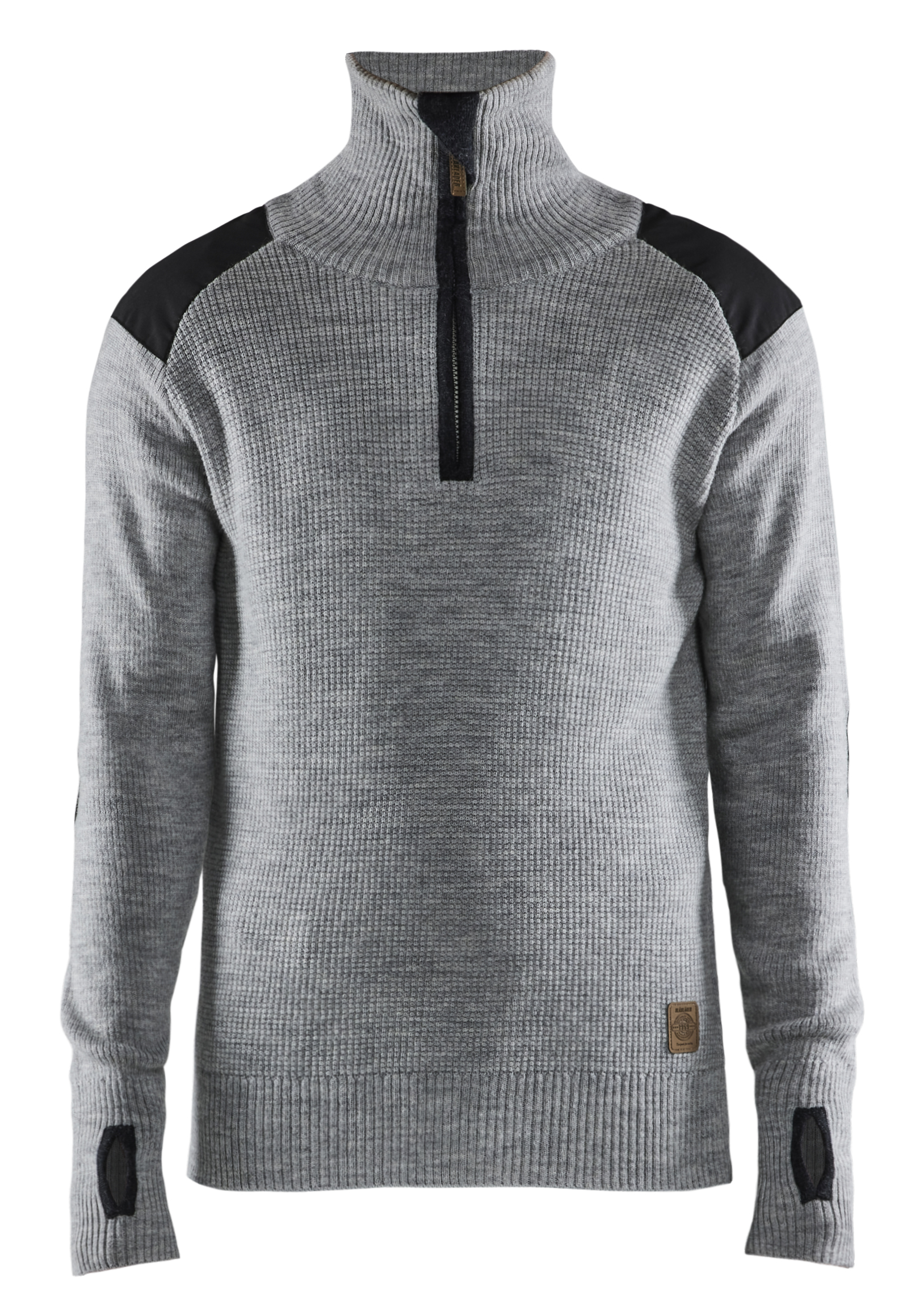 Tämä työvillapaita on selvästi paksumpi kuin useimmat tavalliset villaneuleet, ja siinä on vahvistetut olkapäät ja hihat, jotka kestävät paremmin työliivien, kantohihnojen ja valjaiden aiheuttamaa kulutusta. Lisäksi peukalonaukot ja korkea kaulus vetoketjulla on suunniteltu käytännön työtä varten.