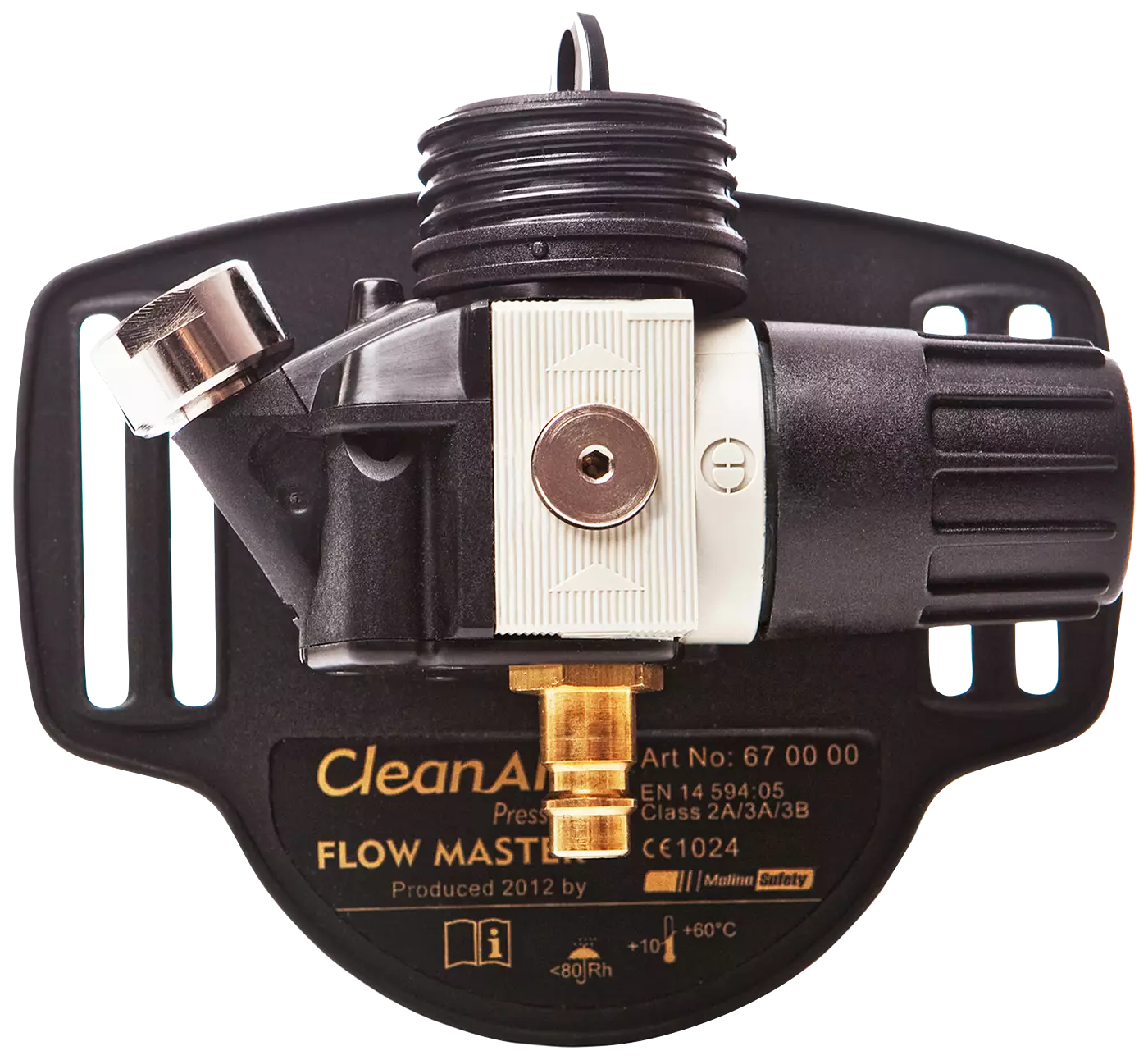 Järjestelmä CleanAIR Pressure Flow Master voi säätää paineilmajärjestelmästä tulevaa ilmaa ja säilyttää sen toivotulla tasolla riippumatta ensiöpaineen muutoksista. Säädettävän ilmanvirtauksen lisäksi siinä on varoituspilli, joka varoittaa käyttäjää, jos ensiöpaine alittaa sallitun tason (350 kPa). Sopiva ratkaisu työympäristöihin, joissa on mahdollista käyttää hengityskelpoista paineilmaa. Edut: Kevyt paino. Taloudellinen käyttää. Korkeat ilmanvirtausmäärät. Varoittaa matalasta ilmanvirtauksesta.