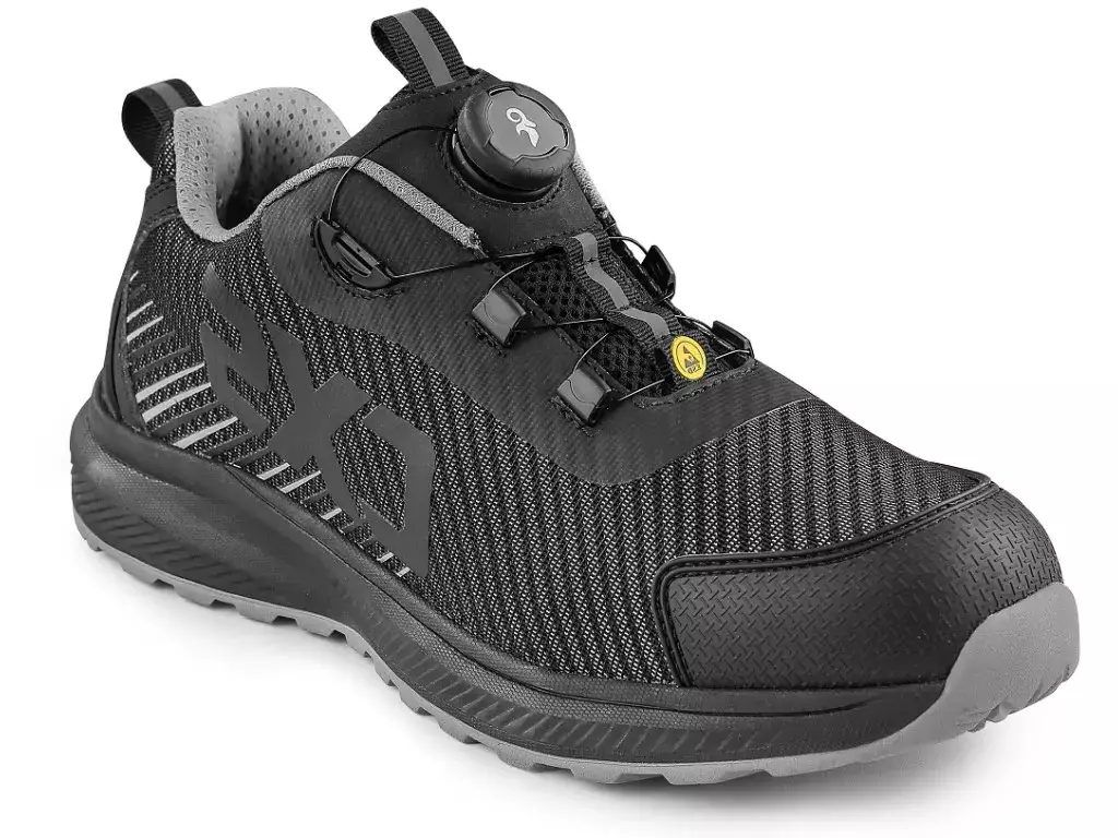 CXS ISLAND Saba S1PS ESD turvakenkä, jossa on hengittävä päällinen, komposiittivarvassuoja ja tekstiilinen naulaanastumissuoja sekä heijastavat yksityiskohdat. Sen erityinen kiristysjärjestelmä mahdollistaa nopean säätämisen ja avaamisen.
