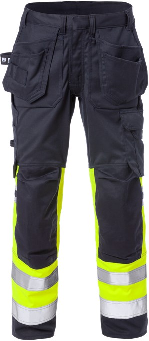 Joustava kangas / Likaa, öljyä ja vettä hylkivä / Kaksi etutaskua / Kaksi CORDURA®-vahvistettua riipputaskua, toisessa kolme pienempää taskua ja työkalulenkki, toisessa yksi lisätasku / Kaksi CORDURA®-vahvistettua takataskua, toisessa läppä ja piilopainonappikiinnitys / Kaksoistikattu haarasauma / Vasaralenkki / CORDURA®-vahvistettu mittatasku, jossa kynätasku, nappi ja lenkki puukolle / Reisitasku, jossa läppä ja piilopainonappikiinnitys, puhelintasku, jossa läppä ja tarrakiinnitys, D-rengas läpän alla / CORDURA®-vahvistetut sisäpuolelta avautuvat polvitaskut / Polvitaskuissa polvisuojille korkeudensäätö / CORDURA®-vahvistetut lahkeensuut / Heijastinnauhassa vahvistettu kaksoistikkaus / Hyväksytty standardin EN 14404 mukaisesti yhdessä polvisuojien 124292 kanssa, EN 61482-1-2 APC 1, EN 61482-1-1 ELIM: 8 cal/cm² EBT: 9,6 cal/cm² (ks. valokaaritaulukosta standardin EN 61482-1-2 lk 2 mukaan sertifioidut vaateyhdistelmät ja open arc -sertifioidut vaatteet standardin EN 61482-1-2 lk 2 ja open arc standardin EN 61482-1-1 mukaisesti), EN ISO 11612 A1 B1 C1 F1, EN 1149-5 ja EN ISO 20471 luokka 1 / Kangas on hyväksytty standardin EN 13034 mukaisesti / Hyväksynnät 50 pesun jälkeen / Testattu teollisen pesustandardin ISO 15797 mukaisesti / ÖKO-TEX® -sertifioitu.