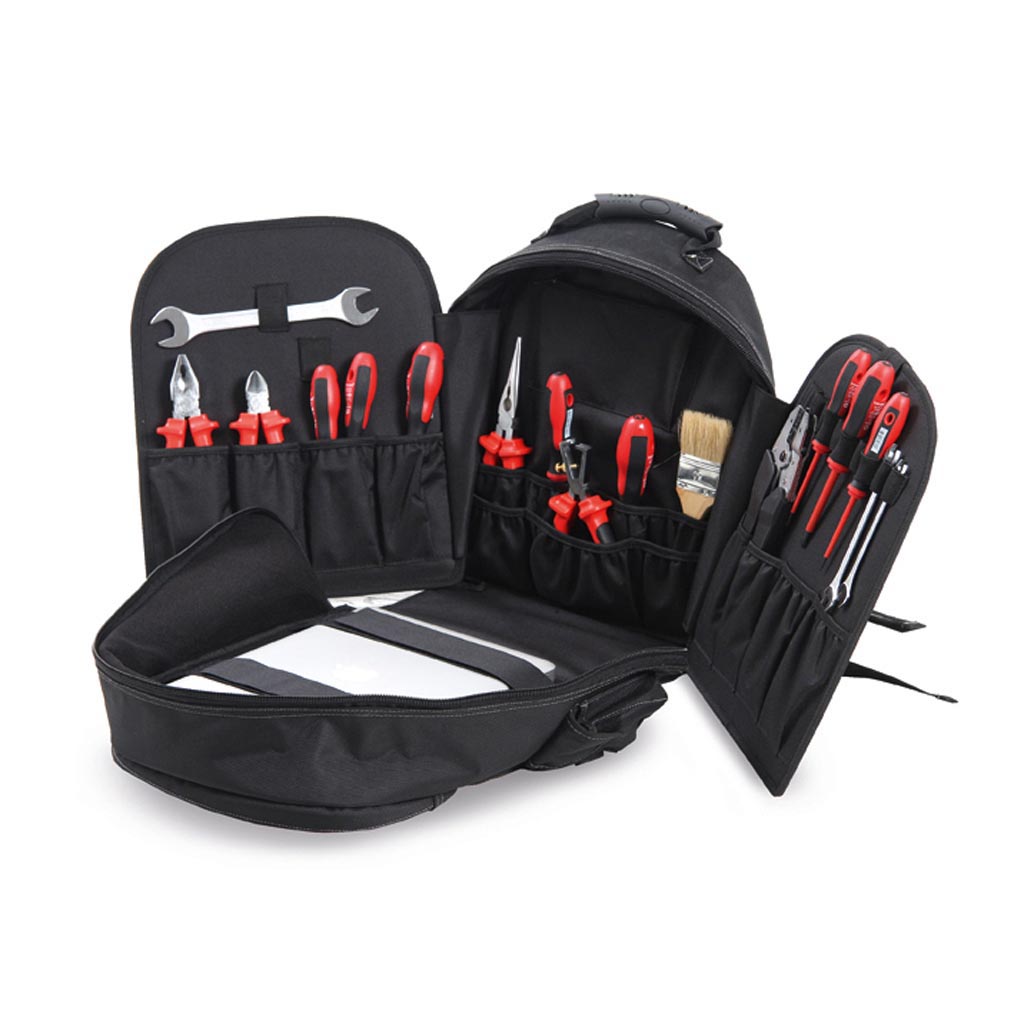 HEPCO Työkalureppu Polytex. Erittäin hyvin kulutusta kestävä ja kevyt Polytex-materiaali. Kantavuus 15 kg. Kestävät vetoketjut. 3 isompaa, monipuolista vetoketjullista taskua joissa työkalukiinnikkeet ja paikka mm. asiakirjoille tai kannettavalle. Työkalut eivät sisälly hintaan. 420 x 350 x 210mm.