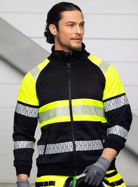 Tämä collegetakki on sertifioitu EN ISO 20471 -standardin luokan 1 mukaisesti, mikä takaa hyvän näkyvyyden hämärässä ja pimeässä työskennellessä. Materiaalina on kestävä ja mukava sekoitekangas: 75% polyesteriä ja 25% puuvillaa, jonka paino on 280 g/m².