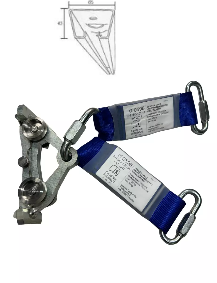 Sopii tikkaissa olevaan matala profiiliseen kiskoon. Kiskon huulet kääntyvät sisäänpäin. Kiskon ulkohalkaisija levey 65mm ja korkeus 43mm. Tikkaan tarraimessa on mukana nykäyksen vaimentimet.