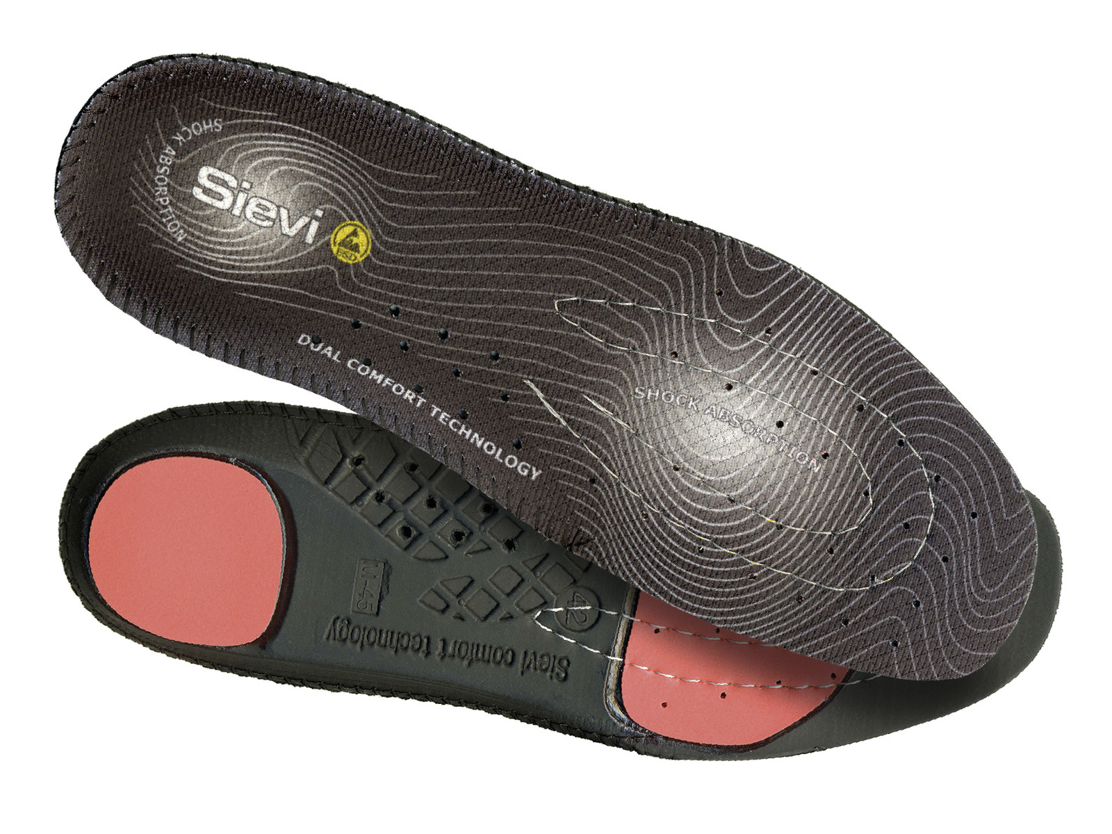 Pohjallisissa on iskuja ja rasitusta vähentävä iskunvaimennustyyny sekä kantaosalla että päkiän alla. Iskunvaimennustyynyn materiaali PORON® on erittäin kestävää, ja pitää ominaisuutensa rikkoutumatta kovassakin päivittäisessä käytössä. Sievi Dual Comfort -pohjalliset ovat saatavilla sekä normaalilla lestin leveydellä että XL-laajuudessa. Pohjallinen täyttää ESD-normit. Pestään käsin.
