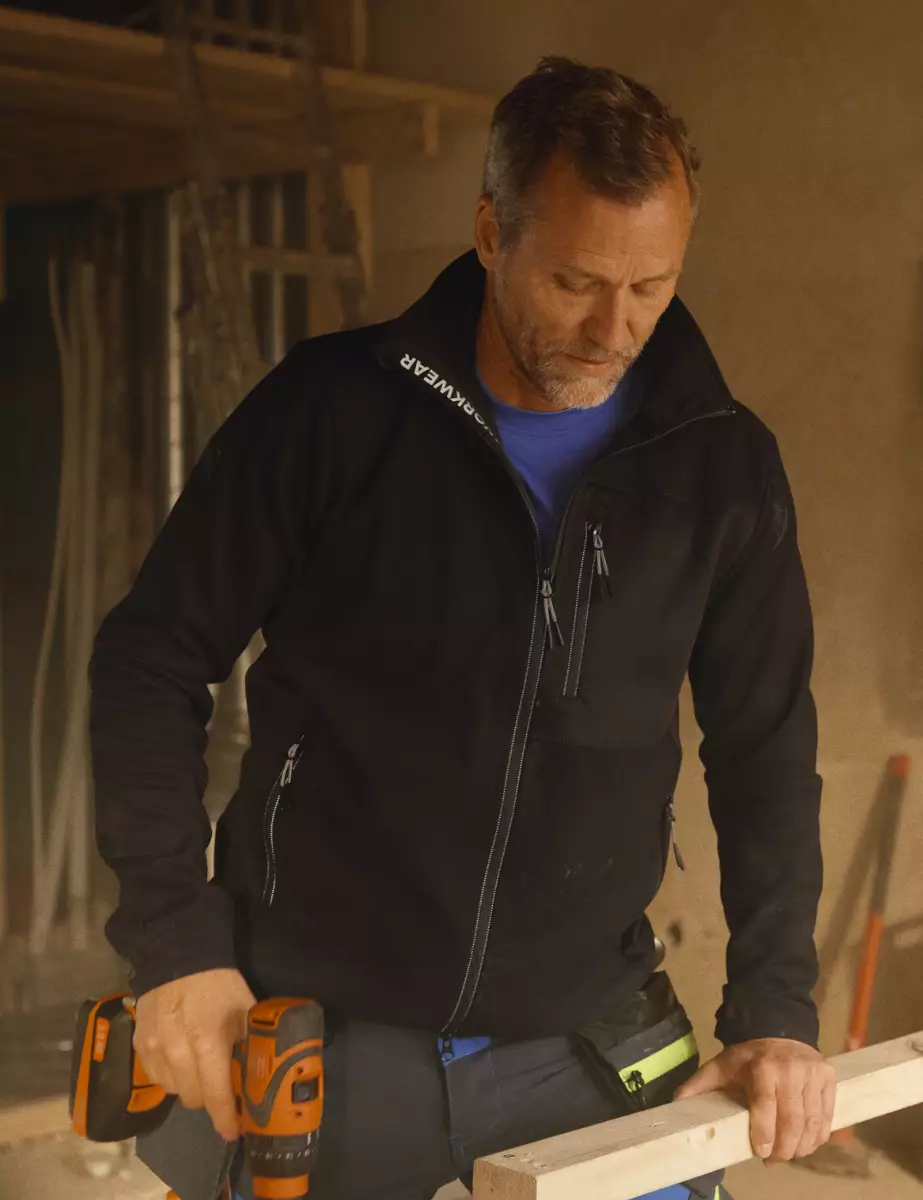 Liikkumisen vapaus: Täysvetoketju mahdollistaa takin avaamisen kokonaan, mikä helpottaa pukemista ja riisumista sekä tarjoaa joustavuutta lämpötilan säätelyyn. Joustava materiaali ja esitaivutetut hihat takaavat liikkumisvapauden ja mukavuuden työskennellessä. Kestävyys ja toiminnallisuus: Kaksikerroksinen verkko/interlock-kangas on kestävä ja hengittävä, ja se sopii erinomaisesti aktiiviseen käyttöön. Kierrätetyn polyesterin käyttö on ympäristöystävällinen valinta. Heijastavat vetoketjut ja painatus niskassa parantavat näkyvyyttä ja turvallisuutta hämärässä. Useat taskut, kuten vetoketjutaskut ja riipputaskut, tarjoavat runsaasti säilytystilaa työkaluille ja muille tarvikkeille. Peukaloaukot hihansuissa pitävät hihat paikoillaan ja estävät niitä nousemasta ylös. Materiaalit: Päällyskangas on kestävää ja joustavaa kierrätettyä polyesteriä (71 %), polyesteriä (25 %) ja elastaania (4 %). Kankaan paino on 390 g/m², mikä tekee siitä sopivan viileämpiin olosuhteisiin. Kontrastikangas on kevyempää ja joustavaa kierrätettyä polyesteriä (95 %) ja elastaania (5 %). Kankaan paino on 290 g/m².
