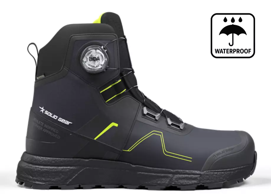 Solid Gear Revolution 2 GTX turvajalkine yhdistää kitkapohjaisen Michelin-kumipohjan, erittäin kevyen ETPU-välipohjan ja NANO-varvassuojan, mikä tekee siitä kevyemmän ja mukavamman kuin monet perinteiset turvakengät. BOA Fit System mahdollistaa tarkan ja tasaisen kiristyksen koko jalkapöydän alueelle, mikä parantaa istuvuutta verrattuna tavallisiin nauhallisiin turvajalkineisiin. Lisäksi komposiittinen naulaanastumissuoja ja metallittomat suojaelementit vähentävät painoa ja soveltuvat hyvin ympäristöihin, joissa metallin tunnistus on käytössä.