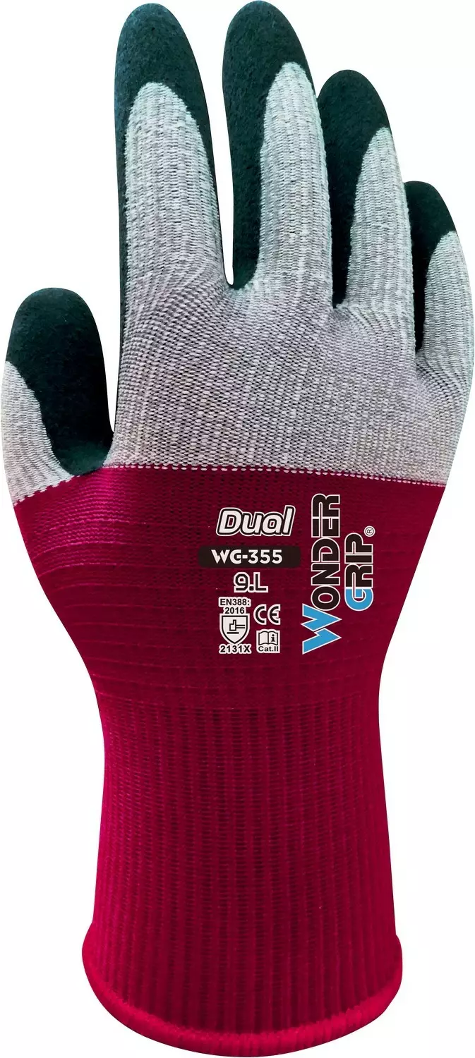 WG-355 Dualin perustana on innovatiivinen DuaLiner™: nailonkudosranne ulottuu käden keskelle saakka ja varmistaa mukavan ja varman istuvuuden, ja hengittävä mikrokuitukudosvuori rystysillä ja sormissa tarjoaa erinomaisen näppäryyden, pehmeyden ja sormenpäiden tarkkuuden. WG-355 Dual -käsineen yksinkertainen lateksipinnoite auttaa pitämään erinomaisen otteen monissa käyttökohteissa ja se auttaa voittamaan työn haasteet tarkkuuden avulla joka päivä. Koot: 7/S-11/XXL - käsine on tehty kahdesta eri materiaaliasta: nylon neulos ranteesta selkämykseen antaa käsineelle hyvän ja turvallisen istuvuuden. Loppuosa käsineestä on mikrokuituneulosta, joka antaa erinomaisen hengittävyyden, suojan ja joustavuuden - lateksipinnoite kämmenessä ja sormissa takaa loistavan pidon ja sorminäppäryyden Laatikossa 144 paria