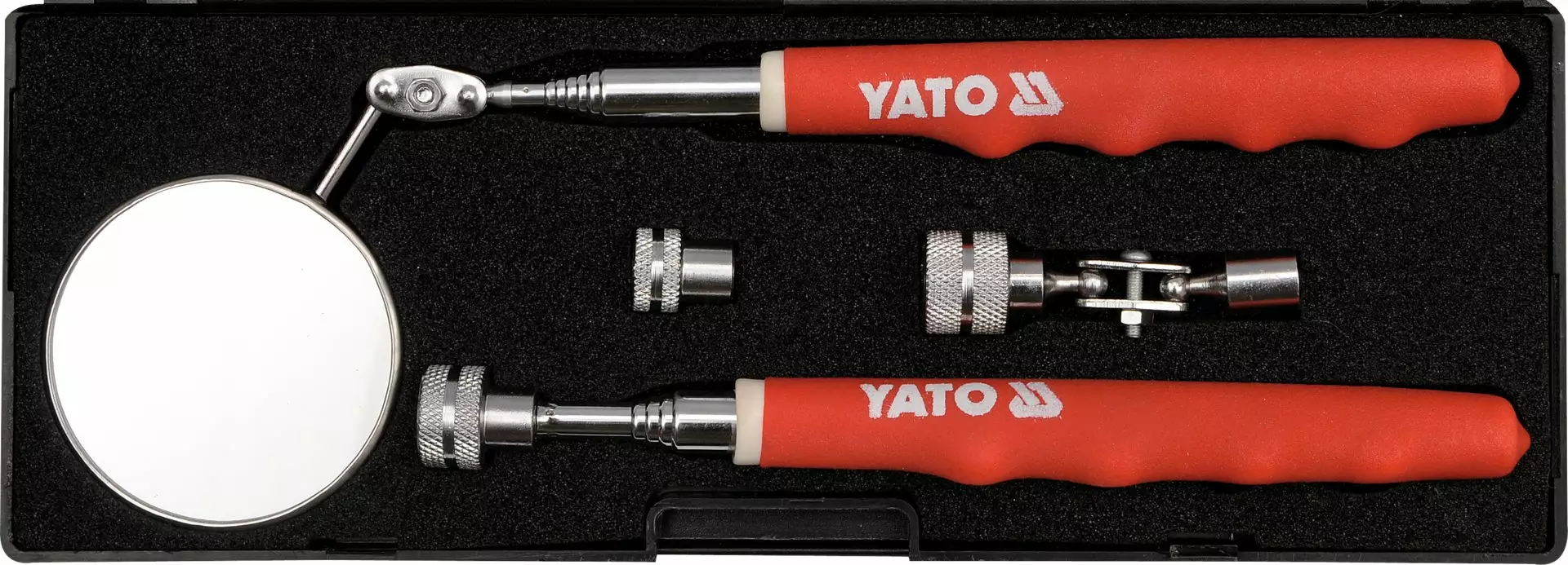 YATO:n teleskooppinen peili- ja magneettityökalu on monipuolinen tarkastussarja, joka helpottaa työtä ammattimaisissa korjaamoissa, huoltopisteissä sekä monilla teollisuuden aloilla. Sarja on suunniteltu erityisesti vaikeasti tavoitettavien alueiden visuaaliseen tarkasteluun ja pienten metalliesineiden, kuten ruuvien tai muttereiden, noukkimiseen ahtaista koloista.