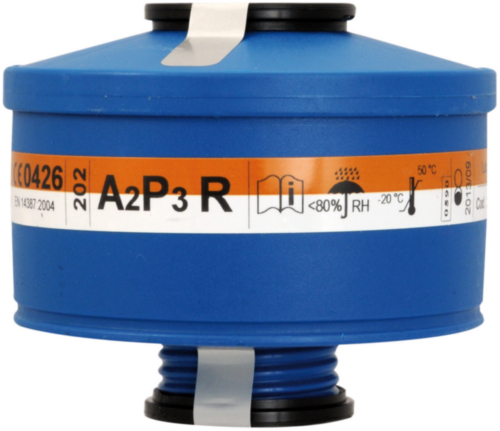 Yhdistetty suodatin, luokka 2 kaasusuojalle ja hiukkassuodatin luokka P3 R, standardin EN 14387:2004 + A1:2008 mukaan.