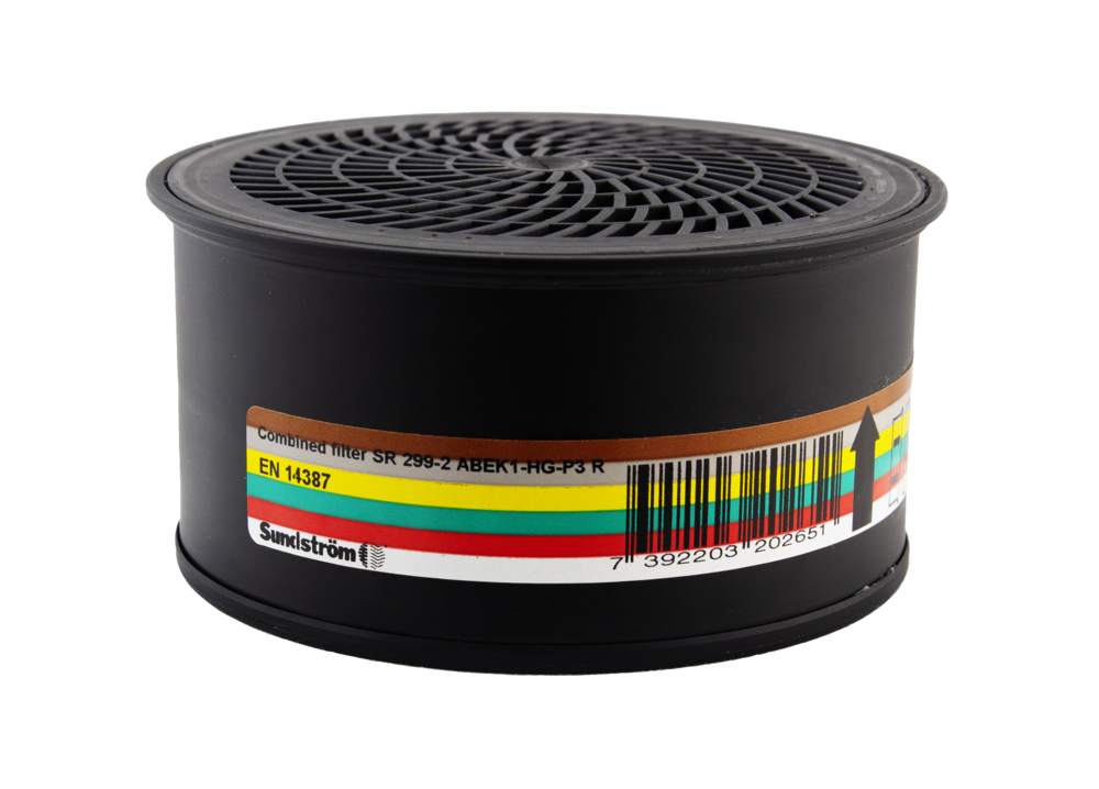 SR 299-2 on yhdistelmäsuodatin, jossa on 1 luokan kaasusuodatin ja 3 luokan hiukkassuodatin. Suodatin on suunniteltu käytettäväksi Sundströmin koko- ja puolinaamareissa. Suodatin on tyyppiä ABEK1-Hg-P3 R ja se suojaa seuraavantyyppisiltä kaasuilta, höyryiltä ja hiukkasilta: Tyyppi A suojaa orgaanisilta kaasuilta ja höyryiltä, kuten liuottimilta, joiden kiehumispiste > +65 °C. Tyyppi B suojaa epäorgaanisilta kaasuilta ja höyryiltä, kuten kloori, rikkivety ja syaanivety. Tyyppi E suojaa happamilta kaasuilta ja höyryiltä, kuten rikkidioksidilta ja fluorivedyltä. Tyyppi K suojaa ammoniakilta ja tietyiltä amiineilta, kuten etyleenidiamiini. Tyyppi Hg suojaa elohopeahöyryltä. Varoitus! Enimmäiskäyttöaika on 50 tuntia. Tyyppi P3 R* suojaa kaikentyyppisiltä hiukkaepäpuhtauksilta kuten pölyltä, sumulta ja savulta. *R (Uudelleenkäytettävä): Suodatin on tarkoitettu käytettäväksi pidempään kuin yhden työvuoron ajan.